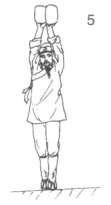双腿并立,两手持重物,左右直臂平伸。吸气时意守丹田,同时两手向下捞起,立肘贴肋。喷气踮脚,同时双臂上举伸直合并,意守涌泉穴。共练习50次(图5)。