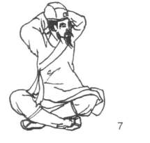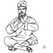 双腿盘坐,两手合抱于腹前,,吸气意守丹田,身提放松不动。引气时收肛、抓趾,然后屏息不出,拱手缓缓升举过顶,同时驱意由丹田随手上行于头顶百会穴。再以鼻呼气,意识散开,两手微分下行按至丹田。共练习25次(图6)。