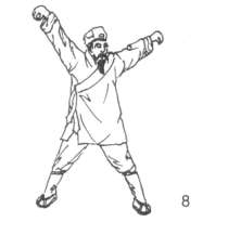 两腿跨立,身体前俯90度,双手背护于精门(两肾眼)。吸气时双手与地面平行前划过头,接着向下拂至裆前变勾手。起身左转90度立身,双勾手沿体前向左右作猿臂上提,同时喷气意守丹田。再接着一边转体还原,一边将两掌用力下擦双胁肋,同时将余气用鼻呼尽。左右各练习25次(图8)。