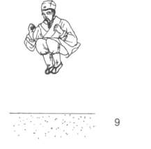 着沙衣以骑马步蹲于沙坑中,吸气意守丹田,然后屏息引气下导昆仑穴,同时两脚向地下沉坠旋钻(如被革缚下拽),让黄沙没住脚踝直至更深,再缓缓用鼻将余气呼完,呼气时意在膝眼和命门穴并将腰椎后突。接着调息一次,吸气开始意聚百会穴,喷气时奋力上跃。共练习30次(图9)。