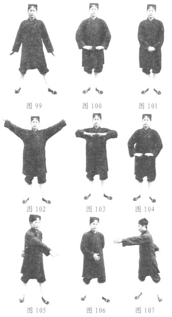 (2)然后,左脚向左横开半步,重心位于两腿之间,两臂向身体两侧平举。(图102)