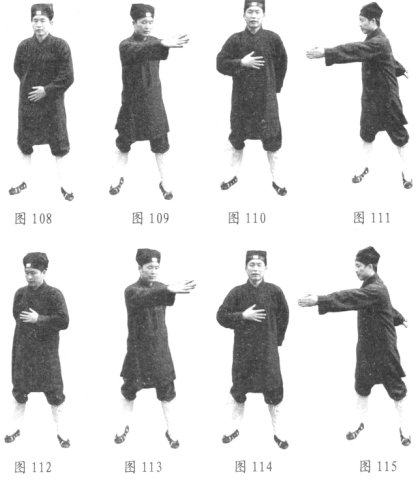 ②拍打中脘穴(图109-112)。每次练习均以左右手拍打穴位三次,多则不限,因人而异。