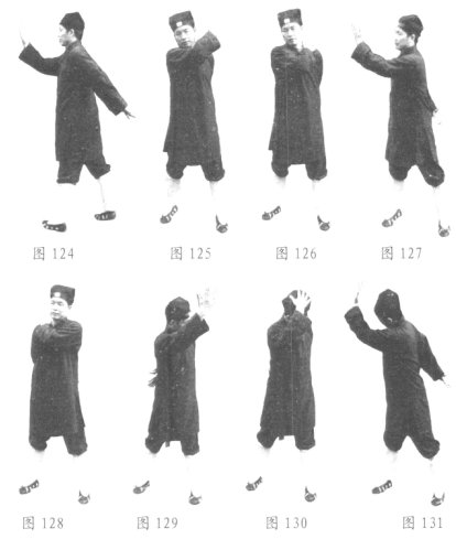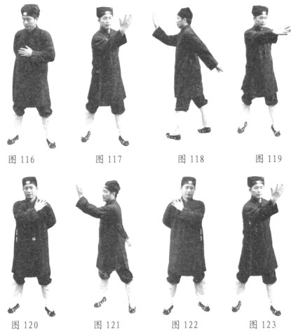 ④拍打左右中府穴(图117-122)。每次练习均以左右手拍打穴位三次,多则不限,因人而异。