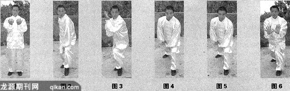 双手在胸前可以呈十字形,或同时上一步向前上方起手时鹰捉,在上后脚过前脚,后手从下向上向上翻、转、裹、钻、践而出,前手从前向后捋带而回,这样一进一退,一阴一阳,一虚一实,一起一落地盘练。也可一手前、一手后的盘练,进退左右,移动重心,成三角、圆形、S形四门八方的盘练。还可以上后脚向前踩出,成前脚内扣,前膝弓,前脚趾抓地,膝与脚垂直内裹,腰不塌,后脚在后,向前支撑蹬直,足跟落地,全脚掌贴地面,从头到后脚成一笔挺的倾斜直线,两腿在一条直线上,受敌面积小,后脚置于中线上,后足撑地并微向外撇,足跟扎实,此为心意六合拳门的牮柱步。前脚有“脚打踩意不落空”,后脚有“机巧全在后脚蹬”,犹如墙快倒时,用以长木头以斜着支撑墙壁之意,故称牮柱步。双手为后手按在前手背,向前下方捋、捉、塌,微有抽带之意。双手向前下方拧,要拧到几乎成一条鞭状时,两手同时下捋,后手变前手在膝前内侧,五指向前,掌心向下,后手在后裆前,下捉时头顶项竖,下颌内收,三尖照,六合合(图4)。