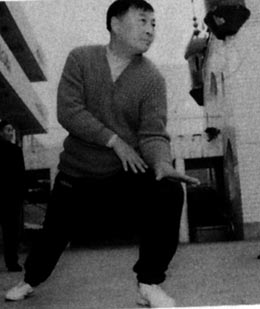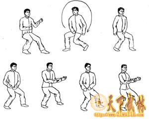 1、桩:自然站立,左脚前伸,脚跟着地,脚尖上跷。两腿下蹲,重心在右腿。左手五指自然分开,屈肘上抬于面部前方,掌心向内,指尖与鼻尖同高。右手下按于右腿外侧,掌心向下五指自然分开。这样,肩与胯合,肘与膝合,手与足合,做到了外三合。左右变换,量力而行。站桩时要沉肩坠肘,谷道上提,舌顶上腭,自然呼吸。