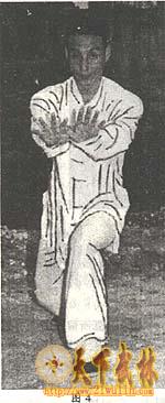 承上式,左足向前一大步,屈膝前进下有踩劲,右腿在后蹬劲,足跟贴地外扭或右弓步,前膝前踩后脚直蹬,前脚尖向前,脚趾抓地,足心含空,屈膝前弓,右足在后为支撑,向前蹬直足跟落地成牮柱步,同时意守下丹田,由下丹田引气至胯部环跳穴至膝的阳陵泉至脚的涌泉穴,这样可使下部骨节气盈力足,则下部有力,步法既疾又快。同时五指挥开,掌心内顶,除拇指外余四指端微内扣,掌心含空,虎口撑圆,此拳可使全身贯气,气行四梢。同时以意开启上三节的肩井穴到肘的曲池穴至手的劳宫穴,这样意到气到力到,可使臂出劲有力。左手立掌根前吐,从大腿内侧循弧线向上翻,右手在右胯际提与左掌会合,虎口推住左手指根与手腕际双掌合劲,并从小腹前走斜前方推出,前不过足,高与胸齐,同时左足向左斜方过步屈膝成虎步,臀勿外突,两肘抱肋,两肩裹劲,丹田抱劲,头顶颏收,左肩前领,目前视,三尖照,双手扑出时的劲来源于后腿蹬及腰胯的催动,两目前视(图4)。