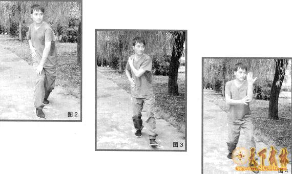 1.接上二式,屈身下蹲,左手炸掌(五指分开)贴附于左膝里侧上方,右手炸掌(五指分开)放于右胯处,两眼平视,高中低架依个人功力情况而定;右脚蹬地摧动左脚和身形前移,同时左手炸掌不变经右胯、右肘、肩和耳处划圆向前停落在眼前八寸左右处,高与眼平;右手炸掌跟随左手臂运动,停落在左肘处(左肘尖顶住右手虎口合谷穴);身体重心前移至左脚;动作不停,右脚越过左脚搓地,如掷地风似卷起后落下;与此同时,左手向下揉按落至右小腹处,右手随同落到右胯处;身形继续前移,重心落至右脚,然后左脚再向前跨越右脚卷地而出,左手重复经右胯、肘、肩、耳和面部向前划圆停落在眼前八寸处,有手仍随同在右肋处划小圆停落在左肘弯处,完成一个单式拳架动作,如此反复进行(图2~图4)。步法要按“磨膝磨胫”法练习熟练后再按自然的步法进行,整个身形在一步一摇行走中按逆时针方向向中心旋靠走圈,走圈的大小与练习的程度和个人的功力有关,直至到在原地旋转能够忽快忽慢而不眩晕地互换方向反转为止。