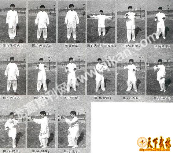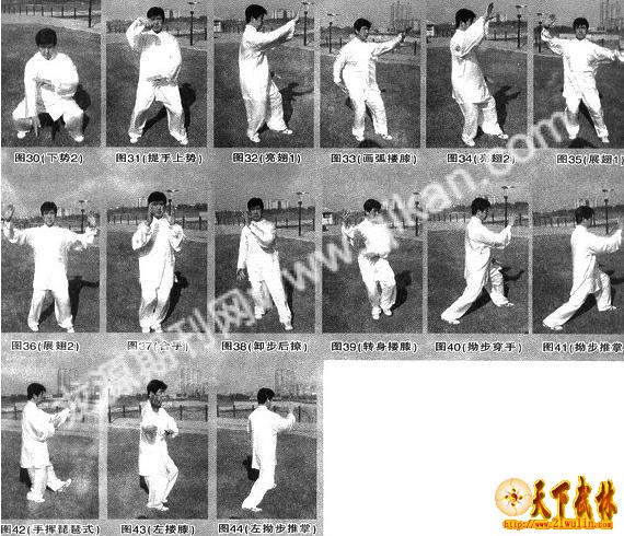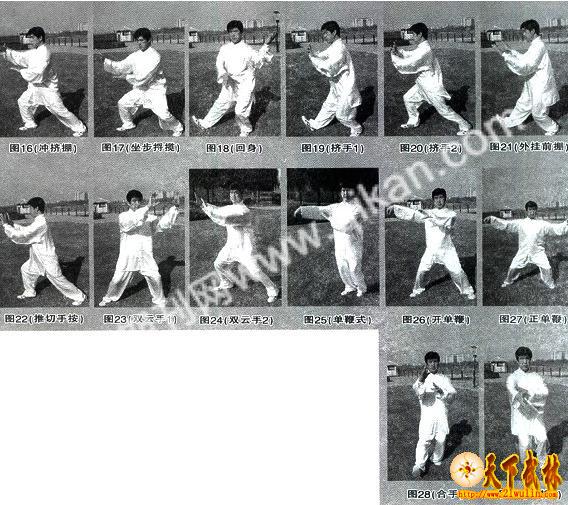 | 心意浑元太极拳,由一代武术宗师申子荣先生,将杨露禅、杨健侯秘传,许禹生、王新午传授的老架太极拳,与宋书铭武当三十七式太极拳、董海川八卦掌、山西戴龙邦心意拳及浑元一气功法融而为一,以太极拳之形式综合而成的。它既完整全面地保留了传统太极拳之特性,又形成了独特的表现风格;既丰富了太极拳内容,又便于研习内家高深功夫。其最显著之特点是,招式严谨攻防兼备,能快速增长功力。本文作者为心意浑元太极拳第三代传人。 心意浑元太极拳强调以心意运动筋肉,练习时必须精神专注,形欲动意先行,形欲断而意相连,形追意其力必速,意过形其力必透。心意浑元太极拳还认为,人体好似一浑元球体,内有一团元气于体内向外膨起,无棱角,无凸陷。这种由内向外之膨胀力,与自然界大气之压力、地球之吸力相争、相抗、相吸,形成浑元力。这种浑元力犹如一个球,当受外力冲击时能产生反作用力,内气愈足则反弹之力愈大,并能顺来力方向而运动。而且这种浑元力可以在意识支配下,顺力、借力、反力、改变力,按人之意识支配运动,而这种意识支配能力之大小又来源于功力之深浅。心意神志、形态动作,完整一体,浑元一气,往复循环,无始无终,此乃心意浑元太极拳也。 本套路是申子荣先生所传,为老架七十六式太极拳。 1.预备式 并步立正,右腿微微向下弯曲,身体下坐(图1)。 左脚上提至右脚踝处,成鸡形步后向左平行开步与肩同宽,脚尖向前,头顶上领 (顶头悬,要有虚领顶劲),双目平视,下颌内收,舌抵上腭,齿微扣,面部表情安详自然,松肩坠肘,收臀提裆(上提合谷),双膝外展,裆要圆撑,膝部放松微屈,两掌指尖向前,虎口撑圆,掌心下按,拇指轻顶于大腿外侧,两腋虚松(图2);静立凝神鼻吸鼻呼,深呼吸3次,然后两掌外旋成拇指向前,食指转向两侧,松腕垂掌指尖向下(图3);脚跟微上翘离地,脚趾抓地,两手掌心向下,顺两侧向上平穿?起至与肩同高,手指略上翘约与两耳根平齐(图4);两臂向里合,虎口相对,食指向前时两臂与肩同宽(图5),松肩坠肘,手腕随屈腿下按(图6),经腹部至两大腿外侧,身体直立成无极式(图7)。此式为大鹏展翅。随身体开合升降自然深呼吸,如此重复3~9次。 注意:两臂上抬时,既要伸展,又应松肩坠肘,两手高低一致,起动速度要均匀,力量应由脚及腿及腰及肩及肘至手,节节放松,节节贯穿。 作用:唤起全身注意,放松舒展肌肉经络,调顺呼吸,振作精神,以调动意识,加强心意运动肌肉骨骼功能,使内气运行,起到调身、调息、调意的作用。此为无极而太极、太极归无极、动静互为根、奇正互为生的大周天运行。 2.揽雀尾 由左顾右盼、开步提手、进步冲挤、坐身捋揽、回身挤手、外挂前?、推切手组成。 接上式。两臂上提,两掌虎口相对,双膝弯曲,食指上领抬至与肩平齐(图8);两腕微向下按至胸部(图9),身体向左微转,左手随腰带肩向左上微?至略高于左肩,右掌里挤至与胸同高,横至人鼻中线处(图10);随后身体向右旋,双掌略下按后,右手上?至略高于右肩,左手里挤至与胸同高(图11)。此为左顾右盼。 身体继续右旋,同时右脚外摆约45°,重心右移至右腿,左脚提起收至右脚踝处,成鸡形步(图12)。右腿前蹬,左脚向前迈出一步,宽度约为两脚,同时左臂随左脚上步向前向上向外?起,右手向下向后向外捋按至腹脐部位,左手屈肱向前上方?起至拇指与鼻尖对齐,向前不超过脚尖,左膝也前不过左脚尖、后不过左足跟,即在脚掌中间(图13)。此为开步提手。 然后左腿后蹬、左脚里扣45°,身体随之右转,右手向外抹眉画弧至腹部,左手由下向上画弧至身体中线,高与鼻齐(图14),收右脚至左脚踝处,向前上一步,同时右手屈肱向前上方?挤而起,至右手拇指左右高低与鼻齐,前与右脚齐,此为上步冲挤(图15、16)。 右腿后蹬,左腿后坐,两臂向怀内合、掌心相对,向下捋揽至右手至左腰胯处,此为坐身捋揽(图17)。 上动不停,身体后坐回身,左右掌同时向前翻挤而出,左手指尖搭于右手心内侧、屈臂向前?挤,至右手拇指与鼻同高,与此同时两腿成右弓步,右手右膝不超过右脚尖。此为回身挤手(图18~20)。 上动不停,右腿后蹬,身体后坐,重心移至左腿。两手掌心向下,两掌外分成勾挂之势,向下勾挂至胸腹前,两手内合,虎口相对,两手外挂时隐含前?之意(图21),此为外挂前?。 然后,右脚前落,左腿伸直,成右弓步,两手由腹部沿中线向上向前再向下扑按而出,至食指与鼻尖同高、双手前与右脚齐为度,两掌虎口相对,掌心向前,坐腕立掌,掌根发力(图22)。此为推切手按。 注意:在做揽雀尾时应头顶虚领身灵动,松肩坠肘肋不空,两手相抱又相撑、上?又下按、后捋又前挤,奇中求正,正中求奇,奇正相生,浑元一气。 3.正单鞭 接上式,右脚里扣90°,左脚外碾45°,身体左转成正面,双臂由右向左上方画立圆,作双云手绕环(图23、24),至右手与右肩同高处,右掌变勾手,向斜后方直臂伸展,腕高与肩平,左掌回收护于右胸外侧右腋下方,同时重心右移至右腿,左脚收至右脚踝处成单鞭式(图25)。 上动不停,左脚横向跨出一步(约两脚半宽),左肘向上向外,左掌画弧外劈至极限处,成侧立掌,食指尖高与鼻齐,两臂向两侧极力伸展,松肩坠肘,里合外?。此为开单鞭。随后身体下沉成马步,此为正单鞭式(图26、27)。 注意:两臂向两侧既要伸展还须松肩坠肘,两肩微向里合,两手与两膝平齐,含胸拔背,下颌微收,成马步下蹲,收臀提裆,脚尖向前,两膝外展,气要