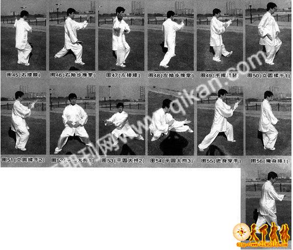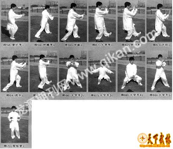 由手挥琵琶式和左右搂膝拗步组成。 上动不停,双手里合(图37),重心移至右腿,左脚收至右脚踝处,右掌下按向后画弧翻转成掌心向上,平托至高与肩平齐,左掌同时由外向内画弧至右手臂肘弯处,左手拇指对齐右手肘弯,身体向左旋转(图38、39),右腿后蹬,左脚向左斜前方上步,重心移至左腿成左弓步,同时左手由外向内齐右肩过右胯下搂于左膝外侧,右手掌心向下过耳际向前穿出至极限处,掌心向前,坐腕立掌,掌根吐力,食指尖高与鼻齐,右手与左脚对齐(图40、41)。此为左搂膝拗步。 上动不停,左腿向后蹬,右腿后坐,左掌顺左胯向上挑起,右掌向里下按,两手参差相对,肘微垂,右腿屈蹲支撑,左脚在前,脚尖上翘、脚跟着地成手挥琵琶式(图42);身体向右转,重心移至右腿,左脚收于右脚踝处,两手画弧推出同前搂膝拗步,再右脚后蹬,左脚向左斜前方上一步,成左搂膝拗步(图43、44)。 左脚后蹬,重心后移,左脚外摆45°,右脚前蹬,重心移至左脚,收右脚于左脚踝处,成鸡形步(图45),同时右腿向右斜前方迈出一步,右手齐左肩向下向外画弧至右膝外侧,然后左手下按后画弧上托经耳际向前穿出至极限处,掌心向前,坐腕立掌,掌根发力。此为右搂膝拗步式(图46)。 右腿后蹬,左腿后坐,重心后移,右脚外摆45°,左脚前蹬,重心前移至右腿,收左脚于右脚踝处,呈鸡形步(图47),右脚前蹬,左脚向左斜前方上一步,手的动作同前左搂膝拗步,成左搂膝拗步(图48)。 注意:前穿推掌时,应力起于足,发于腿,形于腰,达于手指,由腿及腰及肩及肘及手。 7.手挥琵琶 由挥琵琶式、立圆揉手、平圆大捋组成。 接上式,左脚后蹬,重心移至右腿,左脚后撤回收至正前方,脚跟着地成前虚步,左掌顺左胯上挑,拇指高与鼻齐,前与左脚尖对齐,右手掌心抚于左手肘弯处,成手挥琵琶式(图49)。 重心移至右腿,收左脚至右脚踝处,成鸡形步,右腿前蹬,左脚向正前方进步,重心前移至左脚,右脚跟步收于左脚后跟处成鸡形步;同时双手由前向下向后捋至左胯外侧,左掌由掌心向下翻转画弧成掌心向上平托,右掌心向前向上推托,右手食指高与鼻齐,左掌平,掌心向上;右掌立,掌心向前,两腕相合,向前穿推,立圆画弧。此为立圆揉手(图50、51)。 上动不停,左脚后蹬,右脚后撤一步,两手收于腹前,掌心向内,指尖相对(图52)。身体右转,重心右移,双掌向右斜前方伸出,掌心向下由外向内平圆画弧至左腿前方,重心前移至左腿(图53),然后双手回捋,重心移至右腿,下蹲成左仆步,同时左掌外翻,掌心向上,收于左腿前,右手掌心向下拇指对于左臂肘弯处(图54),右腿向前方由下向前上方蹬起,重心移至左腿,成左弓步,左掌心朝上,右掌心向下,合掌前推,此为手挥琵琶进身穿手(图55)。 注意:手挥琵琶式是擒拿与反擒拿之主要动作,应走出穿化之精妙。 8.上步搬拦捶 由撇身捶,拦、搬手,冲拳组成。 接上式,右脚经左脚踝处向前外摆45°上半步落地,左手内翻,掌心向下向外后捋按,右手握拳于胸前向外翻转后,向后向下收拳至腰际,收拳时向外翻转再向内旋转,形成翻压裹带之势,此为撇身捶(图56、57)。 左手由外向内画平弧里拦至身体中心线处,再外搬下按,同时收左脚向前上一步,右腿后蹬,重心前移成左弓步,与此时同,右拳从腰际,顺左掌下向前冲出,左掌护于右臂肘弯处,此为搬拦捶式(图58、59、60)。 注意:右拳前冲时要旋转成拳眼向上,使冲拳有拧、钻、探之力。 9.如封似闭 接上式,左腿后蹬,右腿后坐,重心后移,右手由拳变掌向左上方插于左手背向前两腕相搭,成十字交叉(如图61)。 上动不停,两掌外分(图62),至与肩同宽时向里翻转成掌心向前,收左脚至右脚踝处再上步,双掌外分下挂(图63),右脚后蹬,同时双掌向前扑按,食指尖高与鼻齐,双掌在同一平面,上下与左脚对齐,坐腕立掌成虎扑之势(图64)。 注意:掌根吐力,上扑下按,要形成抛物线。 10.十字手 接上式,左脚里扣90°,右脚外摆45°,两手高举交叉于头部前方(图65、66),右脚向右横开半步,两手分开经两侧向下画弧,重心右移,右腿向下曲蹲,双手下抱交叉成十字(图67、68),两腿上蹬起身,双手随起上架于胸前(图69),左腿回收半步,两腿间距与肩同宽,身体直立,双手分开里旋,至与肩同宽时下按至胸部高度(图70)。此为十字手式。由左右贯耳掌接下式。 注意:重心要随裆部运动做立圆移动。