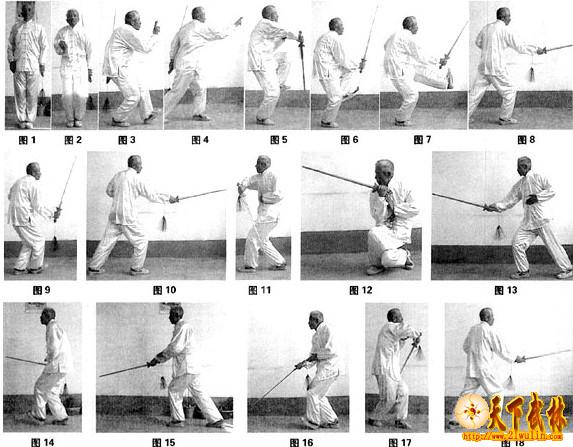 | 剑自古为武术之贵族,素有"剑为短兵之帅"的美誉。刀如猛虎,剑似飞凤,刀称为练,剑名为舞,路法易习,剑点难找,剑两面有刃,锋利异常,便于携带,在器械中最为雅致,修道者或书生与文学家常以剑为伴侣。因其具有修心养性,调心合里,舒身体静,愉悦翻畅,修内健外,壮筋强骨,血液活跃,精神焕发,舒身益气,百病皆除,延年益寿之功能,故名之宝剑。非真人君子,善良仁义之士,礼智道德者,否则难以玩味。 戴氏心意六合剑特点 戴氏心意六合剑,是一种快速敏捷的兵器功法,特别注重点、劈、刺、崩、撩、挑的劲节。演练过程中需细细领悟身械相合,一气贯通,剑术之劲,均在手腕之奥妙。通过丹田滚动,使丹田催肩、肩催肘、肘催腕,劲贯剑尖或三寸剑锋,不失器械为肢体的延长。处处通过戴家拳身法的束展吞吐、起落翻滚来展现戴家剑身催剑走,剑随身行的独特风貌。戴氏心意六合剑法要求动作快妙,全在腰身,上下飞腾,神出鬼没,快若闪电,慢如抽丝,此为剑术之根,对培养人的灵活性、协调性以及攻防意识具有极佳的作用。 歌诀曰: 剑是兵帅剑剑神通剑是飞虎剑点难找 左拦右拔里挑外挂底抽而摸高押而剐 劈砍点扎撩挑挥刺崩缠挎绞舞拦挂格 挤背抽压绕摆拨捉沾摩碾转钻滑惊撅 突脱空化紧凑圆小寒诱冰青抱裹不露 或隐或现恍惚闪电步大头悬六合相照 五心互聚七星返侧反弹惊抖沾连疾决 一势多手 举一反三步步招神招招妙势 戴氏心意六合剑技术图示 第 一 节 1、预备势 两脚并拢,身体自然站立,左手拇指与无名指小指相扣持剑背于身后,食指中指成剑指于剑柄前,右手自然垂于身体右侧,目视前方。头顶天,足抓地,呼吸自然,心无所思,谓之无极,静立片刻,丹田缓缓内扣,两腿慢慢弯曲,呈倒立圆运动。两肘相夹,右手成鸡手与乳齐,肘尖与丹田齐,收臀、提肛、裹跨、缩尾,丹田回扣地出,含胸拔背天收,两肩下沉,头要微仰却要正,目视前方一点,做蹲猴势束身(图1、2)。 2、三才纯阳指 以右脚为轴,身体缓缓左转90度,身体重心移于右腿,左脚置于右脚前呈左虚灵步,上动微停,左脚向前踩出呈虎步,右肩沉扭,左肩自随,右手拇指与无名指小指相扣,食指中指并拢申直成剑指随展身丹田横转掏出经膻中穴向上从口出向前点击,高于眉齐,左手持剑于左腰侧(图3、4)。 3、望怀交剑 左脚收回右脚前,呈左虚灵步,随之身体重心移于右腿,上身呈束身势,左脚抬起置于右膝内侧,左手持剑,剑柄朝上于胸前;同时,右手收回胸前接剑握住剑柄,随之,左手成剑指回挂于左腰侧,右手持剑手腕翻转在身体两侧划弧,持剑于身体中心线,剑刃朝前后方向(图5、6)。 4、快步七星剑 左脚前蹬落地踩出,随之,右脚过左脚向前迈进一步踩出呈虎步,右手持剑向前下方劈点,劲达三寸剑锋,剑刃朝前后方向,左手成剑指护于左腰侧(图7、8)。 5、凤凰三点头 右脚向前迈进一步,左脚向前跟进一步,右手持剑手腕下压,剑尖上挑再向前劈击,劲达三寸剑锋,剑刃朝前后方向,左手成剑指护于左腰侧,上动不停,右脚向前迈进一步,左脚向前跟进一步,右手持剑手腕下压,剑尖猛向上崩,劲达三寸剑锋,剑刃朝前后方向,承接上势,右脚再向前迈进一步,左脚向前跟进,右脚向前踩出呈虎步,右手持剑向前点扎,劲达剑尖,剑刃朝前后方向(图9、10)。 6、青龙摆尾 以两脚跟为轴,身体左后转180度,身体重心移于右腿,左脚置于右脚前呈虚灵步,右手持剑手腕翻随转身剑尖顺逆时针方向划弧下扎,左手成剑指护于左腰侧(图11);上动不停,身体下势,两腿左前右后交叉下蹲,两膝相扣呈左地盘步,右手持剑手腕里翻回裹于左胸前,剑尖朝前,向前点击,剑刃朝左右方向。左手成剑指护于右肘处(图12),上动微停,两脚蹬地旋起,左脚前寸,右脚向前迈进一步踩出呈虎步,右手持剑手腕外旋,手心朝上向前点击。左手成剑指护于右手腕(图13)。 7、翻腕冲剑 右脚抬起向后退一步,身体重心移于右腿,左脚置于右脚前呈左虚灵步,右手持剑手腕下压,使剑尖猛向上崩,劲达剑尖,左手护于左胸前(图14),上动不停,左脚向前迈进一步踩出呈虎步,右手持剑手腕翻转,在身体右侧划弧向前冲剑,劲达剑尖,剑刃朝上下方向,左手成剑指护于右手腕(图15)。 8、虚步格剑 左脚收回右脚前呈左虚灵步,身体重心移于右腿,右手持剑向左格剑,剑刃朝左右方向,由前向左下方削,劲达三寸剑锋,左手成剑指护于右手腕(图16)。 9、蜻蜒点水 左脚前寸一步,右脚过左脚向前迈进一步,脚尖里扣,身体重心移于右腿,身体左后转180度,左脚置于右脚前呈左虚灵步,右手持剑手腕翻转,随转身剑尖按顺时针方向划弧向前反扎,左手成剑指护于右手腕(图17);上动微停,左脚前进一步,右脚过左脚向前踩出呈虎步,右手持剑手腕翻转在身体两侧划弧,随展身向前点击,劲达剑尖。左手成剑指护于右腰侧(图18)。 10、盘根探海 原步不动,身体下势向右后转180度,两膝相扣,呈右半地盘步,右手持剑向后反撩,左手成剑指于左胸前(图19),上动不停,身体继续下势呈右地盘步,右手持剑收回右胸前再向前点击,劲达剑尖,剑刃朝左右方向。左手成剑指随右手刺剑对拉于左腮处,头向右转,目视剑尖(图20)。 第 二 节 11、乌龙绞柱 两脚蹬地旋起,身体重心移于右腿,以右脚为轴向左后旋转270度,左脚向前踩出呈虎步,右手持剑手腕翻转,随转身平扫,剑刃朝左右方向(图21正、反),上动不停,重心移于左腿,右脚过左脚向前迈进一步,呈半交叉地盘步,右手