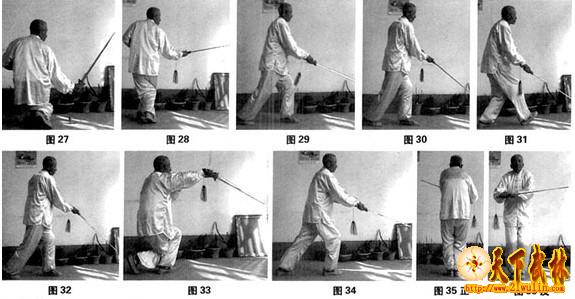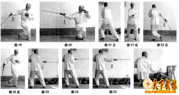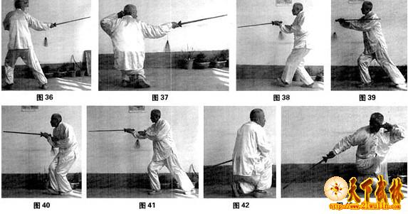 19、青龙探爪 左脚向左侧横跨一步,右手持剑手腕外翻由左向右划一弧形(图36),紧接,右脚向左脚前迈进一步呈右半地盘交叉步,右手持剑向右侧方平刺,随即收回再刺出,劲达剑尖,左手成剑指随右手刺剑对拉于左胸前,头向右转,目视剑尖,剑刃朝左右方向(图37)。 20、顺水推舟 身体左转90度,左脚向前迈进一步,右脚过左脚再向前迈进一步置于左脚前呈右虚灵步,右手持剑向前反撩,劲达剑尖,剑刃朝上下方向(图38);承接上势,右脚向前踩出呈虎步,右手持剑手腕翻转在身体左侧按逆时针方向划弧剑把朝前向前顶出(图39),上动不停,身体重心移于左腿束身,右脚收回左脚前呈右虚灵步,右手持剑手腕翻转回拉于右胸前(图40),随之,右脚向前踩出呈虎步,右手持剑手腕里旋随展身向前平扎,劲达剑尖,目视前方,剑刃朝上下方向(图41)。 21、叶底偷桃 原步不动,以两脚跟为轴,身体向左后转180度,两膝相扣,呈左地盘步,右手持剑手腕里扣,随身体下势,从身体左侧向身后下扎,劲达剑尖,剑刃朝上下方向,左手成剑指护于右肩前(图42),上动不停,两脚蹬地旋起,右脚过左脚向前迈进一步,呈交叉步,右手持剑手腕外翻由左后向前划弧,承接上势,身体下势,两膝相扣,呈右地盘步,右手持剑手腕里扣在身体两侧划弧挎绞,随身体下势向身体右后方下扎,劲达剑尖,剑刃朝上下方向,头向右后转,目视剑尖,左手成剑指护于右腮前(图43)。
