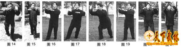 站立的步法、手形与左式丁八步旋法试力的起式相同,周身各部的意念活动相同。向右后下发力时,右后腿弯曲,臀部猛然下坐,似把支撑臀部的树墩砸坐入地。左脚五趾扒地,头与前脚,后胯与前膝,前后腿内侧似有弹簧猛然上下斜面相争。由于后腿、身体向右后下方的运动,双手五指似把相系的弹簧猛然拉断。双手、双臂同时配合把扶按的铁球猛然向右后回拉,似把扶按的铁球猛然从身体的右后外侧甩出。回拉时,身体重心为后七前三,一拉即止。步法、手形与左式丁八步旋法试力的起式相同。身体重心为五五位置。右式的发力与左式原则要领相同。(见图16-18)