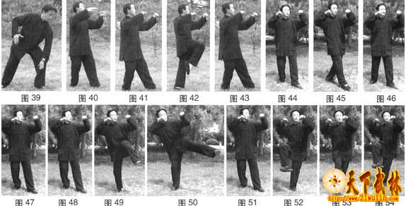 站立的姿势同独立桩相同。意念假借我们身如巨人,怀抱一棵参天大树,身体与大树融为一体。臀部似坐在树干上。大腿、小腿、后腰、背、颈部部似与大树融为一体。站立说应感觉到非常的平稳。头与左脚似有弹簧微微上下相争,头与抬起的右脚踝部似有弹簧上下斜面相争,右脚掌底部似踩着一根粗大的弹簧,左胯与右前膝似有弹簧左右前后微微相争。意念假借调整好后,开始练习左脚的蹬踏发力。首先左脚下踩,微向前蹬、上站,催动身体微微向前,向上。身体猛然微向后靠,似有挤靠大树的相争之力。这时右脚右腿猛然向下,微向前蹬,微向内挤合,用右脚掌横向的内掌缘部,似有蹬踏对手的前腿膝部及膝部以下的迎面骨,要有蹬断踏碎对手的前腿之意。右脚右腿发力时,头与左脚似把上下相系的弹簧猛然拉断,头与右脚踝部上下斜面相争的弹簧猛然拉断,右脚掌在蹬踏时,意有把脚掌下粗大的 弹簧猛然踩进地里之意。左后胯也同时配合把右前腿膝部前后、左右相系的弹簧猛然的拉断。右脚在向下向前蹬踏发力时,脚掌不要踩地,大约离地十公分左右。一发即止,身体重心,手形姿势仍回到起式时的姿势,右式的发力式与左式发力原则要领相同。(见图51-54)