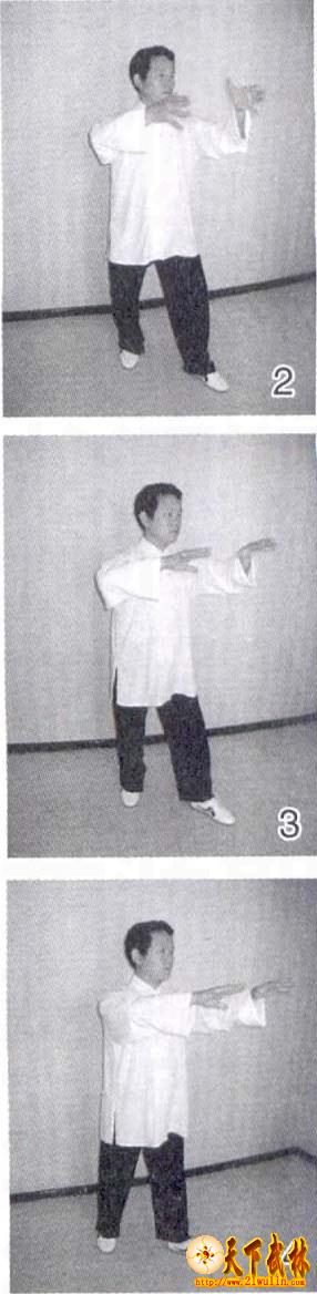 三、定步扶按球试力 1.定步扶按球试力对身体姿势的要求 双脚站立姿势为左式丁八步,重心为前三后七。双手掌心向下,手指微屈向前,双手相距二至三拳,左手顺左脚尖的方向前伸,左手掌根部在左脚脚面上方,头部向左微拧,即头、手、脚三点一线,右手在左手后面近半掌的距离并低于左手半掌高度,双手向前伸出相当于手臂全长度的70%,手掌部高于肘部,两手掌位置约在胸腹部之间,肩部自然放松,身体自然站直(图9)。 2.定步扶按球试力的意念要求 意念假借周身站在齐腰深的水中,双手臂下面扶按着一漂浮在水面上的球。首先后腿缓缓下踩上蹬,头微顶,双手突出腕部向上提起,前脚掌轻轻下踩,后脚与前脚之间有微微挤合之意。 双手在向上提球时,要以上提的力为主,内合、向前的力为辅。此时意念假借身体的胸腹部、两腿之间仿佛与球粘在一起。这时由后腿向前、向上蹬地,身体的重心渐渐移动到前脚掌上,重心分配为前七后三,此时双手配合上提到头顶的两侧,身体前倾约30度(图10、11)。 这时意念假借装满水的大球突然变成了漂浮在水面上的空球,并有很大的浮力感,我们要将漂浮在水面上的球再重新按进水里。首先,前脚掌缓缓向后蹬地,后腿配合坐靠,同时手臂下侧把漂浮的水球整体下压,以下压的力为主,外分、回拉的力为辅。身体微微向后似有挤靠大树之意。这时身体的重心已变为后七前三了,双手臂已回到起势的间架位置(图12)。 3.意拳扶按球试力练习的目的和意义 扶按球试力主要针对向上和向下力量的练习。这是意拳基本发力(也称虎扑)和下压发力的基本功,同时也是意拳推手常用的技术之一。 四、走步勾挂试力 1.走步勾挂试力对身体姿势的要求 身体成左式定步勾挂试力基本姿势站立,身体各部分的意念要求与定步勾挂试力完全相同,身体重心为五五位置(图13)。 2.走步勾挂试力的意念要求与练习方法 姿势摆好后,开始向前行进,这时后脚掌缓缓前蹬,重心前移,双手的外形不要变化(图14)。 这时前脚掌微微前蹬上站,用身体带动左后腿脚掌平行从烂泥中前方行进,在后脚掌平行从地面拔起的瞬间,双手同时配合慢慢地回拉,假借把手臂从大团饴糖中缓缓拉出,突出肘部外分,双手的掌根下侧微微外旋,要以手臂回拉的力为主,外分、上提的力为辅(图15)。 回拉时,由于肘部外分双手的手掌微微内合,这时右脚掌微微向前行进到超过左脚尖一脚掌距离时,双手配合回拉到距胸部尺许远。这时右腿右脚向斜前方横趟,右脚掌尖轻轻踩地,同时意念假借回拉的双手臂仿佛被麻绳缠绕,双手臂拧转时意有把麻绳拧断之意。这时双手已旋转到掌心向下,手指向前成丁八步平推试力拉回的姿势,身体的重心为前三后七(图16、17)。 随即意念假借将双手平行慢慢向前推出,把双手臂插入饴糖中,前推时要细心体会有向前、挤合、微微下按的阻力感,推完时姿势成定步平推试力的定势(图18)。 随即练习左后腿行进的试力。左后腿行进的试力对身体各部位的意念要求与右后腿的意念要求完全相同(图19~23)。 五、走步分挂试力 1.走步分挂试力对身体姿势的要求 身体成左式定步分挂试力基本姿势站立,身体各部分的意念要求与定步分挂试力完全相同,身体重心为五五位置(图24)。 2.走步分挂试力的意念要求与练习方法 后脚掌缓缓前蹬,身体重心移在左脚掌上,为前七后三。双手的外形不变。身体在向前移动时要体会把泥水挤动之意(图25)。 这时前脚微微前蹬上站,用身体带动后腿脚掌平行从烂泥中慢慢拔起离地大约1厘米。这时后脚尖缓缓向左脚跟内侧的斜前方行进。与此同时左前手配合慢慢地开始回拉、外分、微微上提,右手同时配合慢慢回拉、肘部外分,右掌根部有向下扒物之感。这时右脚掌缓缓地向前行进到超过左脚尖一脚掌距离即止,这时双手已回拉到胸部尺许远(图26、27)。 这时右脚掌、右腿缓缓向斜前方横趟,意有把烂泥蒿草横着趟开之意。步子横趟走到丁八步位置时,慢慢将脚尖落下,足跟要虚(足跟离地大约1厘米),这时左手掌、手臂同时向内拧转,意念假借把缠绕手臂的麻绳有拧断之意。右手同时配合微微地外分、回拉,向下有扒物之感。双手成丁八步平推试力拉回时的姿势(图28)。 这时意念假借将双手平行慢慢向前推出,缓缓插入饴糖中,这时右脚已变为前脚,左脚变为后脚,双手在向前推时,要顺着自己鼻梁胸窝的中线平行推出。此时身体为五五重心(图29)。 随即练习左后腿行进的试力。左后腿行进的试力对身体各部位的意念要求与右后腿的意念要求完全相同(图30~33)。 六、走步扶按球试力 1.走步扶按球试力对身体姿势的要求 身体成左式定步扶按球试力基本姿势站立,身体各部分的意念要求与定步扶按球试力完全相同,身体重心为五五位置(图34)。 2.走步扶按球试力的意念要求与练习方法 向前行进时,右后脚掌下踩前蹬,催动身体慢慢向左前脚方向行进,意念假借将周身阻挡的泥水缓缓向前推动,体会身体与腿部有推动泥沙的阻力感,这时身体的重心已是前七后三了(图35)。 随即用身体带动右后腿缓缓从地面平行拔起,与此同时双手臂也缓缓的上提,要突出双手腕部掌心向下,五指似有抓球之意,肘低手高,把双手臂下面的大球慢慢提起,有上提、挤合、向前之意。这时右后腿脚掌在刚刚落到丁八步位置时,当双手掌上提已超过头顶10厘米左右后就不要再上提了,这时身