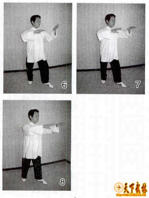 二、定步分挂试力 1.定步分挂试力对身体姿势的要求 以左式丁八步站立,身体的重心是五五位置。双手同时向前伸出手臂约80%的长度,左手不超过左脚尖,掌心向内稍上斜,高度大约在自己嘴部的位置。右手手心向下,手指微屈,腕部向下微扣,横着向内前指,高度在自己的臂部位置,肘低手高。前后手之间相距约二至三拳(图5)。 2.定步分挂试力的意念要求 意念假借周身站在大团的软饴糖中,后腿缓缓向后下坐靠带动双手臂从大团饴糖中慢慢回拉,前手有回拉、外分、上提之意,在回拉时加强肘部外分;后手同时配合前手缓缓向后、向外回拉,肘部微微外分。当双手回拉到胸前尺许远(前臂与大臂约成120度角)时前手掌心翻转向下手指前指。此时意念假借左手臂仿佛被麻绳缠绕,在手臂向内拧转时,要有把麻绳拧断之意。右手同时配合微微外分、回拉、内裹。这时右手已旋转到掌心向下、手指向前,成丁八步平推试力的预备姿势,这时身体重心为前三后七(图6、7)。 拉完之后,意念假借将双手平行缓缓向前推出插入大团饴糖中,前推时有向前、挤合、微微下按之意,并体会手指手臂插入饴糖中的阻力感。向前推完时,身体的重心为五五位置(图8)。 3.意拳分挂试力练习的目的和意义 分挂试力主要练习的是双手臂回拉时,一手上挑一手下挂的力量。这是推手中常用的技术之一。其主要作用是在与对手搭住手之后,运用上挑和下挂的力量,瞬间来破坏对方的间架,为自己创造进攻的条件。