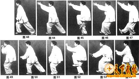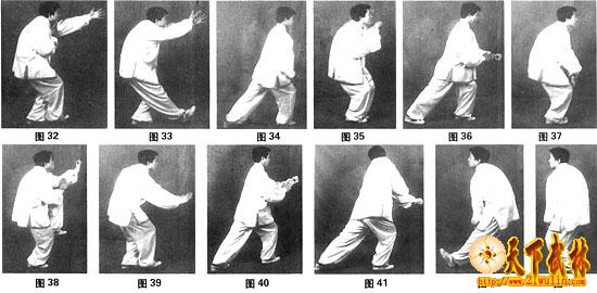 要点:转体束身与横跨左转步,要劲灵、快速、步稳。