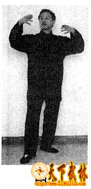 站立的步法与浑圆桩相同,双手慢慢抬起,约与肩平,手心向下,中指相对,虎口微撑,指尖微敛如抓球状;两手腕处微屈,似能夹物,掌高肘低;两手大拇指外侧与大小臂如怀抱大树,前手高于后手约四五公分,两手相距两至三拳。双手双臂前后摸劲时的意念要求,身体各部争力的要求,双腿内侧向内挤合及前后相争的意念要求,与浑元桩前后摸劲的原则要领相同。向前摸劲时,以双手五指、双臂外侧和下侧,同时向前推挤的力为主,以挤合下按的力为辅。向后摸劲时,以双手五指、双腕内侧、双臂内侧和下侧,同时回拉的力为主,以外分上提的力为辅。练习时,只可意想,不可用力。