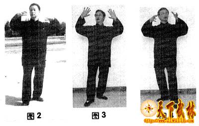 站立的步法、手形与浑圆桩相同。意念假借周身与树融为一体,向上摸劲时,首先后腿下踩、上站,微微前蹬,催动身体缓缓上升,仿佛带动大树上提。头似有上顶之意,两腿内侧似向内挤合,前脚掌轻轻下踩,双手、双臂内侧似把怀抱的大树微微上提;同时,内合、前推,以上提的力为主,内合、前推的力为辅。这时,头与后脚似有弹簧上下相争,一提即止。随即意念假借把树栽回到原来的位置,这时后腿微微下坐,双腿内侧,似有弹簧微微外分,头与前脚、后胯与前膝似有弹簧上下、前后相争;身体下降时,有挤动大树,同时带动双手、双膝向下微微外分、回拉,以向下的力为主,外分、向后的力为辅,将树栽回到原来的位置,一栽即止。随即,就可练习浑元桩上下摸劲了,右式练习与左式相同。