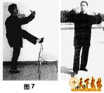站立的步法、手形与单腿依托桩起式相同,六面力同时摸劲的精神假借、意念活动,与浑元桩六面力同时摸劲的原则要领相同。