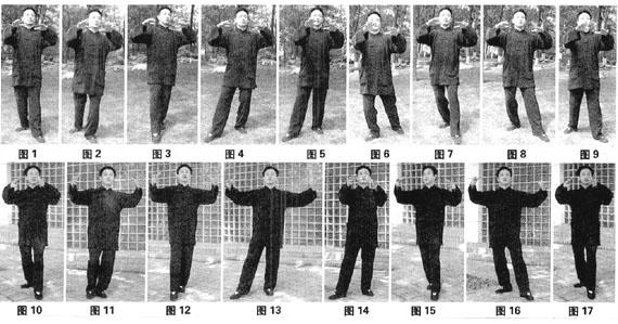 站立的姿势与丁八步开合试力相同,左脚、左手在前,身体的重心为五、五的位置。双腿的意念要求为假借踩在烂泥或蒿草丛中,腹部、胸部假借有水阻挡,双手的高度在胸部位置,两手相距两三拳的距离,双手的五指、腕部似有弹簧与远处的墙上树上相系,微有前后相争,双手的五指、手心、腕部及肘部、手臂内侧的意念要求与丁八步开合试力相同。姿势站好后,右后腿脚掌缓缓前蹬,身体也同时慢慢向前移动到左前脚掌上,这时身体的重心已成为前七后三。身体在向前移动时,要细心体会右后腿、前腿仿佛把烂泥蒿草微微有挤动之感;身体重心慢慢向前移动时,双手的外型不变,意念假借双手掌臂微微扶在水中漂浮的木板上,要求放松地扶按。这时左腿微微前蹬上站,用身体带动右腿脚掌平行从烂泥中慢慢拔起,大约离地一公分,不要与地面摩擦;用身体带动后脚尖缓缓向左脚跟内侧慢慢向前,向斜前方行进;头与右后脚掌似有弹簧微微上下斜面相争,站立的左腿前胯部、前膝部、脚尖部意向前指,右后腿的前胯部、膝部、脚尖部同时意向前指。左右腿在微微向前行进时,意念假借把阻挡的烂泥蒿草缓缓地趟开;在右后脚平行从地面拔起的瞬间,双手同时配合慢慢地外分,外分时一定要突出以腕部的外侧、双臂肘部为主,回拉、上提的力为辅。右脚掌缓缓向前行进到超过左脚尖一脚掌距离时就不要再向前走了,这时右脚掌、右腿缓缓地向前指、向外分,向斜前方横趟,意有把烂泥蒿草横着趟开之意,头与右脚相系的弹簧有上下斜面相争之意,这时右腿右脚已满到丁八步位置。慢慢将右脚掌尖落下,右足跟微虚;这时双手向外已分开大约40-50公分时就不要再分了,这时身体的重心是后七前三了。随即接着做合的试力,里合要以掌根为主;同时注意双手五指、手心腕部、手臂内侧一起配合向内挤合,有挤合、前指、下按的三种力,要突出以合的力为主,前指、下按的二种力为辅;身体配合微微有向内挤动水的阻力感,左后脚掌慢慢下踩前蹬催动身体缓缓向前,左后腿内侧与右腿内侧似有弹簧向前挤合,右前脚掌微微下踩,这时身体的重心已移到五、五的位置;双手向内合到相距两三拳的位置,双手双臂内侧在向内合时仿佛把顶着的弹簧挤压成一团就不要再挤合了。这时如若继续行进,抬左后脚时,其意念要求与行走右脚时意念相同,身体和手掌、手臂的意念要求相同;左脚掌落地时身体重心、双手、双臂向内挤合时意念要求相同。(见技术图示10-17)