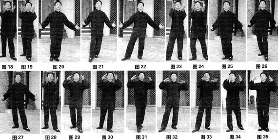 站立的步法与拨水试力相同,身体的重心为五、五的位置,双手的掌心呈斜面向上,手指微曲前指,双手的高度大约在胸部的位置,两手相距两三拳距离。双腿假借踩在泥或蒿草丛中,腹部、胸部假借有水阻挡。姿势摆好后,右后脚掌缓缓下踩、前蹬,催动身体向前脚移动,其意念活动与走步开合试力的腿部身体的意念活动相同,用身体带动右后脚离地的瞬间,右后脚掌尖进行的路线与走步开合时一样;双手同时配合,要突出腕部的外侧、双肘外侧向后向外拨水,要细心体会手指缝、手掌外侧、手臂外侧似有拨水的阻力感;这时双手已回拨到胯部的两侧,右后腿右脚也同时进行到丁八步拨水试力的定势位置,右脚掌轻轻踩地,这时身体的重心为后七前三。右腿右脚掌在前行时,双腿及头与右脚上下的相争力与走步开合试力双腿的意念要求一样;双手在向后拨水时要突出向后的力为主,向下、向外的力为辅。随即左后脚掌下踩、前蹬,两腿内侧挤合,右前脚尖下踩,催动身体向前,双腿的意念要求与走步向里合时的意念要求一样。双手在向前拨水时要突出以掌根为主,向上、向前、内合,以向前的力为主,向上、内合的力为辅。将双手拨回到起势的位置,身体的重心为五、五,双手的掌心呈斜上方,双手相距两三拳的位置。向前拨水时要细心体会有拨动很多水的阻力感。这时如若继续行进,抬左后脚时,其意念要求与右脚的意念相同;身体挤动水,手掌、手臂向后拨水时,意念要求相同;左脚掌落地时,身体重心为后七前三;在向前拨水时,身体催动双手,双臂向上、向前、内合时意念要求相同。(见技术图示18-28)