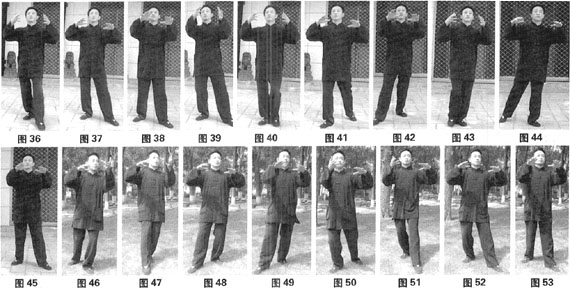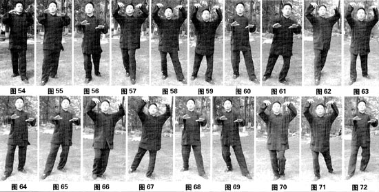 站立为丁八步,手型、身体重心的分配与定步扶按球试力相同。向前行进时,左后脚掌下踩前蹬,催动身体慢慢向右前脚方向行进;在行进时,意念假借将周身阻挡的泥水缓缓向前推动,体会身体与腿部有推动泥沙的阻力感,这时身体的重心已是前七后三了。随即用身体带动左后腿缓缓从地面平行拔起,脚掌离地面约二、三公分,后脚行走的路线与走摩擦步的路线相同。在行进过程中,要意念体会有趟开阻挡在腿部的泥水的阻力感。在左后脚缓缓把脚掌从地面泥水中拔出的瞬间,双手双臂也缓缓的同时上提,要突出双手腕部为主,掌心向下,五指似有抓球之意,肘低手高,把双手双臂下面粘住手臂的大球慢慢提起,有上提、挤合、向前之意。这时左后腿脚掌在刚刚落到丁八步位置时,当双手掌上提已超过头顶十公分左右后就不要再上提了,这时身体的重心是前三后七。随后,右后脚掌下踩前蹬,慢慢向前移动重心,待向前移动到身体重心前七后三时,再将提起的大球慢慢压进水里。首先左前脚掌下踩回蹬,右后腿配合向下坐靠,仿佛要把臀部、两腿内侧下面的石墩慢慢坐进地里,右后腿在向下坐靠的瞬间,要体会与左前腿内侧有微微外分之意,右后胯与左前腿部仿佛似有弹簧前后、上下斜面相争,左前脚掌五趾微微向下扒地,在后腿向下坐靠的瞬间双手的掌根部、双臂及肘部要突出向下压球的力为主。双手五指微微向斜前上方,双手的五指下侧,手掌、手臂中节下侧,手臂根部下侧同时把漂浮的大球整体下压;向下压球时,双手的掌根部、肘部、手臂的根部微微外分,有下压、外分、微微回拉的三种力,要以下压的力为主,外分、回拉的力为辅。在右后腿向下坐靠的瞬间,身体微微向后似有挤靠大树之意,要细心体会后脑部、后颈部、后肩部、后腰部、大小腿后部有微微挤动大树之意。同时要体会左前脚掌与头部上下相系的弹簧有慢慢上下、前后斜面相争,这时身体的重心已变为前三后七了,双手掌手臂已下按到起式的间架位置,随即再进行右后脚走步的试力了。这时右后脚掌下踩前蹬,催动身体慢慢向左脚前方行进。行进中的意念活动,手掌手臂向上提球的姿势,身体重心向前移动,向下扶按球的意念活动与走左脚的意念活动相同。后退走步扶按球试力,左脚左式姿势定式后,身体的重心仍然是前七后三,随即再练习退步的扶按球试力。左后脚在向下坐靠平衡后,用身体整体将右前脚缓缓从泥中拔起,脚掌离地约一、二公分,右前脚向左方横着慢慢向内横趟,横着前进大约到左后脚尖的内侧位置;右脚向内侧横趟时要细心体会趟开泥沙的阻力感,随即用右后脚跟为主慢慢向后行进,要细心体会右脚、右腿将阻挡的泥沙向后慢慢趟开的阻力感。这时再将右脚跟顺着左脚跟的内侧向后、向外缓缓后退,这时右脚掌尖轻轻下踩,右脚在向后、向外后退时要体会头与右脚似有弹簧微微上下相争,两腿内侧似有把弹簧横着横向撕开之意,有把右腿右面的泥沙缓缓趟开之意。就在右前脚刚刚从泥沙中拔起的瞬间,要以双手掌腕部为主,掌心向下,五指似有抓球之意,肘低手高把双手双臂下面粘住的大球慢慢提起,有向上、向前、内合之意,这时右脚掌刚刚落地,双手掌部已超过头顶十公分左右,这时双手双臂就不要再上提了,此时身体的重心为前七后三。随即把漂浮的大球再按进水里,左前脚掌下踩前蹬,右后腿及臀部微微向后下坐靠,左腿与右后腿内侧仿佛似有弹簧微微外分,后胯与前膝部似有弹簧前后斜面相争;在身体重心向后下坐靠的瞬间,双手掌部、肘部、双手臂根部在向下按球时,内在有向下、向后、外分的力;同时,在身体微微回靠时,后脑部、后颈部、后肩部、后腰部、大小腿后部有微微挤动大树之意。这时的身体重心已是后七前三了,随即再做左前脚后退的练习。(见技术图示55-72)