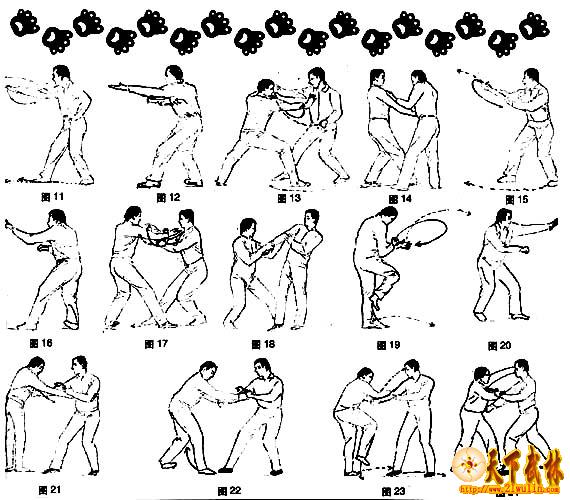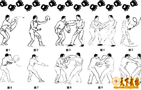 要点:动作要连贯柔韧,以转腰带动手脚发出寸劲。