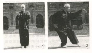 承上势。左脚向前进半步,同时以身向左外磙、拧、转,带动左手从胸向外划拦转到左膝上方,五指向下,掌心向后,拇指内扣掌心,指尖向上,肘心向上坠肘。随右脚跟进半步成半马步,同时右手从胸向后画圆到右腰处,肩内扣,五指向下掌心向内,拇指内扣掌心,侧身而立,受敌面小,而且做成三尖照、六合合。左肩领前,左脚在前,脚尖内扣,前膝内裹,胯同时裹劲;后脚内扣,膝、胯裹劲,与前膝胯的内裹劲形成圆裆的抱劲。目前视,头顶项竖,舌抵上腭,下颌内收,牙齿扣住,两肩松开向下沉,两膀扣劲,含胸拔背,腰下塌,谷道上提,心宁气沉,浑身泰然(图2)。
