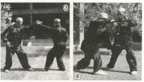 双手在面前“接嘟哇”时,如有人用拳击我前胸,我用双掌一翻击敌前胸。敌如后退,我可进步用左掌一翻撩击敌裆(图3、4)。