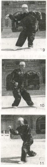 承上势。以头领身,上左脚半步,随上右脚过右脚一大步,步成半马步。同时左手后拽,右手从后向前上翻拧钻出。目前视,三尖照,六合合(图11)。