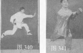 要求:落地时如大树生根,稳如泰山,全身扎劲一f二节劲紧,中节劲坠,下节劲抓,两脚发震地声,两手发出击打声,从丹田大声发出“噫呀”一声,三声合成一声,气势雄伟。这是一组合动作,从“黄龙探爪”、“标把”到“火龙穿心”要连贯有力,一气呵成(图340,图341)。