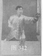 承上势,右拳变掌,掌心朝上,往上托,略向回带,身体同时后坐,左掌以同样姿势往上托至口平,称为过手。承上势,右脚向前跨一步,成右弓步,左手突然下按,同时右掌用力往前推,口发“噫”声(图342)。