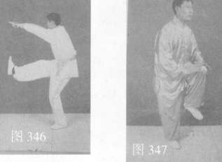 要求:“龙形单把”是远距离击人,速度要快,出其不意。 承上势,双脚向后摆扣,转体180度,成左鸡步,双手贴于两肋前,蓄力待发。 承上势,两手变掌,掌心朝下,中指与食指伸直并分开,指尖朝前,其他三指弯曲,指尖贴于掌心,突然二指向前标去,高与胸平(二指向对方双眼夺去成“二龙戏珠”)(图346.图347)。