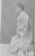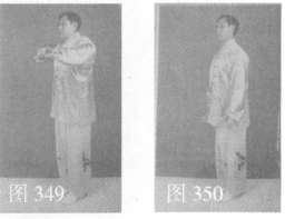 3().收势 承上势,左脚收于右脚齐,与肩同宽,双掌提至胸前(图349)。轻松向下按,呼一口长气(图37),再抱拳、揖手(图350)。