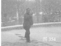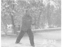 承上势,双手从后向前上方挎、崩打出丹田中节劲,步成牮柱步(图352)。