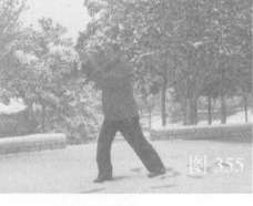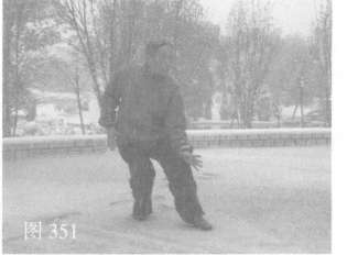 4.挑领 承上势,上左脚半步随追右脚,同时用浑身丹田中节劲向外上挑出右手,左手向下,两手成二争之劲,步成牮柱步(图354)。