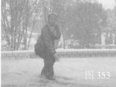 3 .折身 承上势,左手从前向后划圆,右手从下向后划圆,两手一上一下同时转身向后,收右脚向后,右脚变左脚,左脚变右脚,右手护腮,左手在下,一阴一阳,目前视,重心在后,左脚虚点地,在右脚中点处悬起,称悬脚,又叫鸡形小架(图353)。。