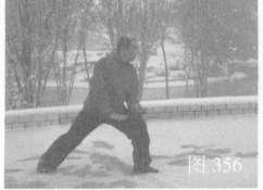 承上势上左脚随上右脚过左脚,双手同时向前下方捉下,步成牮柱步,双手按到膝下,目前视(图 355,图356)