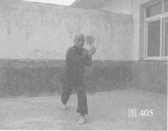 3.横拳 承上势,上三,双手同时从后向斜前方打出,挎提崩劲,目前视,步成牮柱步(图406)。