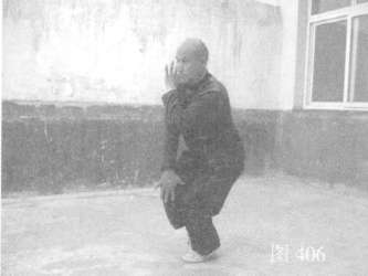 左肩领前,左脚在前,脚尖虚点地,内扣,右脚在后,左手成半握拳或掌皆可,在前膝内侧或前膝上方,掌心向内。右手放在右胯旁,掌心向内头顶项竖,舌抵上腭,下颏内收,牙齿扣住,两肩松开向下沉,两膀扣劲,含胸拔背,腰下塌,谷道上提,三尖照,六合合,势如背锅,身如寒冷(图404)。