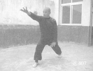 4.挑领 右手下按,左手前挑,掌心向上,目前视,步成牮柱步(图407)。