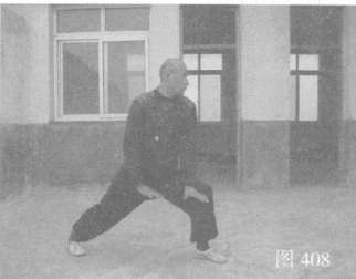承上势,l左脚随上右脚双手同时下按、拽、捉,步成牮柱步(图408)。