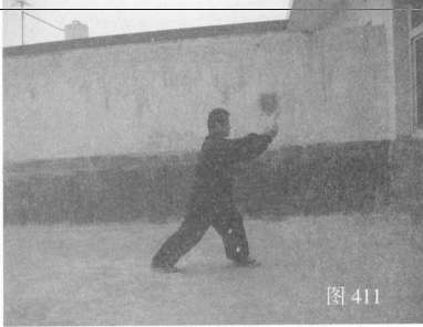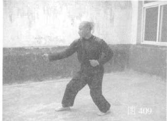 2.横拳 承上势,双手从后向前上方挎、崩打出丹田中节劲,步成牮柱步(图411)。