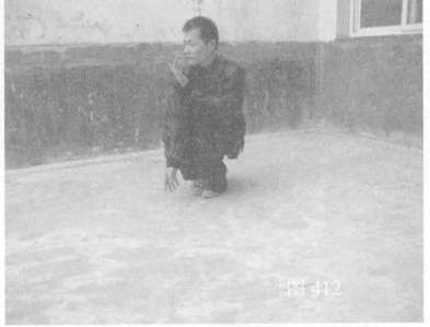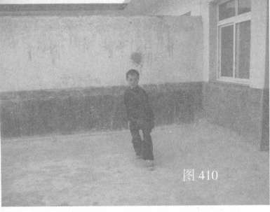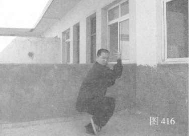 3.折身 承上势,左手从前向后划圆,右手从下向后划圆,两手一上一下同时转身向后,收右脚向后,右脚变左脚,左脚变右脚,右手护腮,左手在下,一阴一阳,目前视,重心在后,左脚虚点地,在右脚中点处悬起,称悬脚,又叫鸡形小架(图412)。