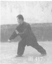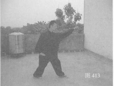 4.挑领 承上势,上左脚半步随追右脚,同时用浑身丹田中节劲向外上挑出右手,左手向下,两手成二争之劲,步成牮柱步(图413)。
