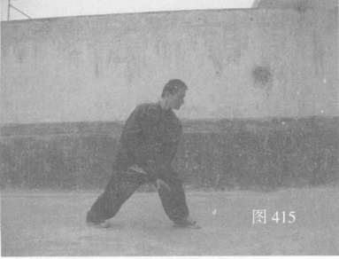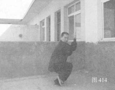 5.鹰捉 承上势,上左脚随上右脚过左脚,双手同时向前下方捉下,步成牮柱步,双手按到膝下,目前视(图414,图415)