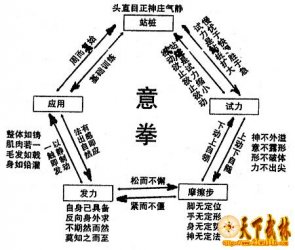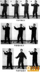 1、意拳养生试力功法概要 练习养生桩有了初步体会后,就可以练习最基础的平步试力了。健身桩的练习实际上就是培养人们如何运用精神假借意念诱导,在身体和肢体不动或微动时,神经肌肉等身体各部都在充分地运动。它是一种无力中求有力,抽象中求具体,不动中求微动,静中求