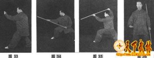 1、正门偏身立正左立掌 身向正南,两腿并拢站立,两臂下垂,右手持枪,枪身直立紧靠身体右侧,插向右脚外侧地上,右手虎口向上,左手由左大腿旁向左向上抖腕立掌,掌指向上,左臂伸直平举。眼看左掌。(图1) 2、左轴轮转 右手将枪由右侧提向胸前,枪身仍与地面垂直,左