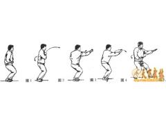 一、龙形 一波未定一波生,好似神龙水上行,猛然一惊冲天起,生光雄勇令人惊。 起势:两腿并立,目视前方。 第一动:左脚向前迈进一步,双腿弯曲,右手曲肘上钻,手心向面;左臂曲肘下按,手心朝下贴于左胯外侧(图1)。 接上动,右脚向前迈进一步,双腿弯曲,左腿蹬劲,