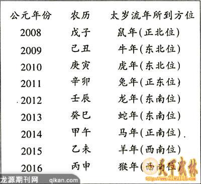太岁,亦称岁神。古人认为,上天有太岁星,为木星,为苍龙,十二年运游一小周天;地上也有太岁,为太阴,按十二地支,十二年运游一小周天。即甲子年太岁在子方,乙丑年太岁在丑方,癸亥年太岁在亥方。凡太岁之年,必有一名当值之神,名为岁神。共有六十名岁神轮候,每个岁神六十年轮值一次。例如,1995年为乙亥年,太岁在亥方,轮值岁神为伍保。凡太岁所在方位,有一股肉眼看不见的巨大加速力与加强力。这股力量是由宇宙星体运行与地面磁场相结合,在特别方位形成的强气场。甲子年,子方气场特别强;乙丑年,丑方气场特别强;癸亥年,亥方气场特别强。例如,1995年为乙亥年,亥方的气场特别强。若在强气场方位内有大的动作(诸如动土建房、机器运转、烟囱火喷、推土爆破等等),将会进一步加强气场的运动。在此范围内有动作的人,特别是年庚为冲太岁的人,就会深受其害,出现工伤或死亡事故。所以,太岁不能冲,不能向,宜静不宜动。所谓“年庚冲太岁”,就是每个人出生的年份,必有一太岁当值,称为“年庚太岁”。若某年年值太岁正处于其年庚太岁之对方,年值太岁与年庚太岁相对相冲,即为“年庚冲太岁”。例如,1938年出生的人,此年为戊寅年,此年生人的年庚太岁为寅,按十二地支排列,寅与申相对相冲。若遇申年,既为“年庚冲太岁”之年。此人在中年就要特别小心,避免寅申两方有大动作,否则将灾祸临头。如果寅年出生的人,建房向着寅方,遇到申年,太岁临申,就等于太岁入屋。屋,就是太岁。寅年生人也出入此屋之门,就叫“冲犯太岁”,同样会灾祸临头。所以,在寅年出生的人,是不能以自己的出生地支来立向的。按地支所编的十二生肖来说,属鼠不能立鼠门,属牛不能立牛门,属虎不能立虎门,属兔不能立兔门等等,为的是不要冲犯太岁。在城市购买房子就要避免大门冲太岁。